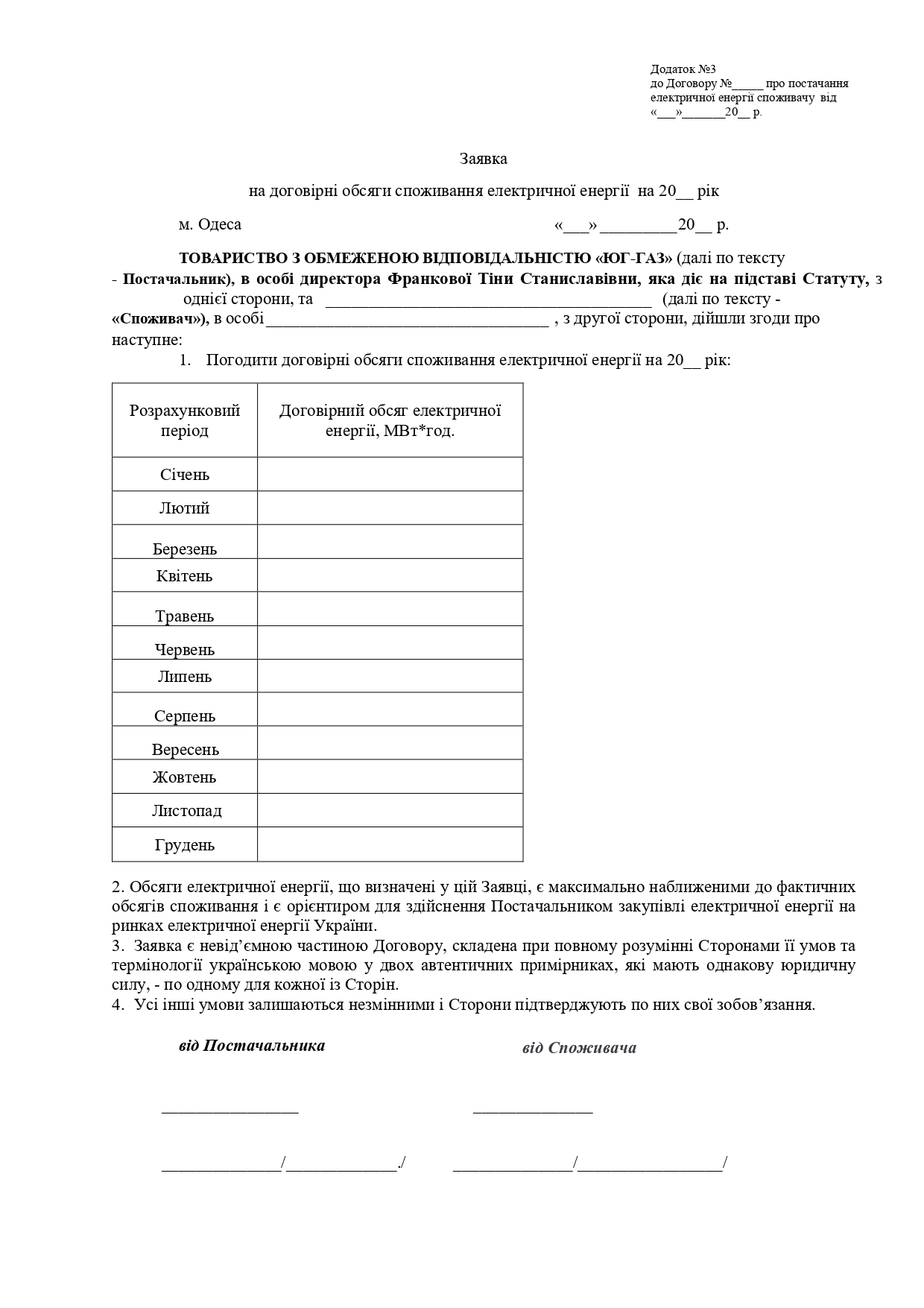 ДОДАТОК 3. ЗАЯВКА НА ДОГОВІРНІ ОБСЯГИ